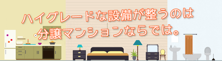 分譲マンションは、高額販売される物件が多く、一生住むということを前提とするので、床・壁の防音仕様、細部の設計にまでこだわった物件が多くあります。また、オートロックはほぼ100%、ファミリータイプには システムキッチン、追炊き機能付バスなど機能・セキュリティー面も充実しています。近年では、共有スペースの充実も著しくエントランスに宅配ロッカーや常駐コンシェルジュサービスなどがあるマンションも増えつつあります。