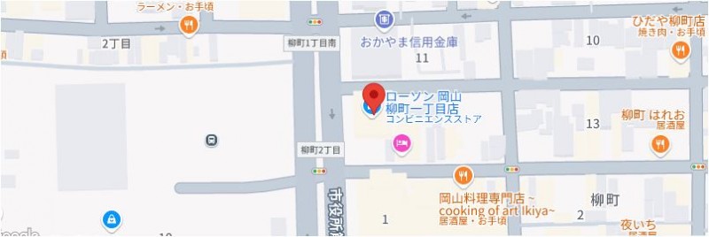 住所は岡山市北区柳町1丁目になります。
