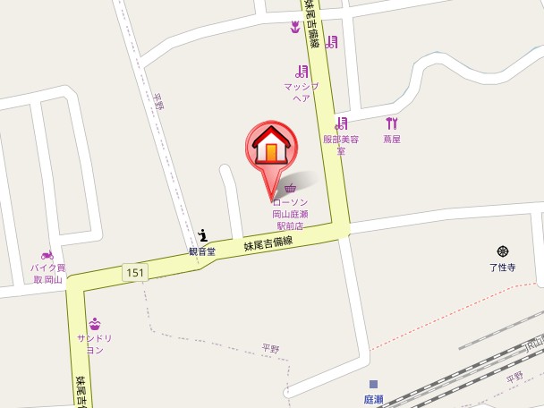 | 交通 | JR山陽本線「庭瀬駅」徒歩1分 JR伯備線「庭瀬駅」徒歩1分 JR山陽本線「北長瀬駅」徒歩39分 |