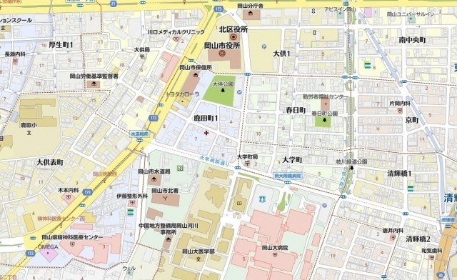 住所は岡山市北区鹿田町1丁目になります。