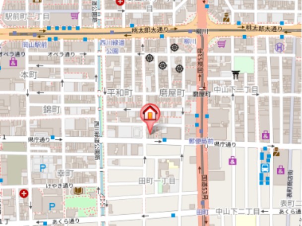 | 交通 | JR山陽本線「岡山駅」徒歩10分 清輝橋線「郵便局前駅」徒歩2分 清輝橋線「田町駅」徒歩3分 |
