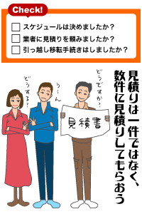 引っ越しを決心したら、まずスケジュールを決めよう。転入手続きや水道・ガス・電気・電話の手続き、荷造りのことなどを考えると、余裕を持って1〜2ヶ月前には引っ越しの準備を始めたい。また、業者に見積りを頼むことも大切。基本的には無料なので、室内をチェックしてもらって、荷造りに必要な箱の数や特殊搬入物(ピアノ・ペットなど)の有無、予算などを相談しておこう。