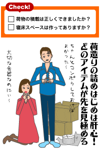 荷物を積む場合には奥に小物、手前に大きな荷物を配置すると搬入が簡単に。箱に明記された配置先を見ながら、大きなものから新居に運び込み、小物などは後から入れる。寝床スペースを確保するのも大切だ。当日は何かと騒がしくなるので、前もってご近所に挨拶しておくとトラブルがない。