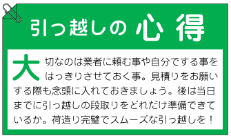 いざ引っ越しの準備を初めてみても、思う様にすすまない…という経験は誰もが一度はあるはず。そんなビギナーに「引っ越しのコツ」をアドバイス。これを見ればスムーズな引っ越しも夢じゃない!引っ越し前の準備(約1ヶ月〜2ヶ月前)引っ越しを決心したら、まずスケジュールを決めよう。転入手続きや水道・ガス・電気・電話の手続き、荷造りのことなどを考えると、余裕を持って1〜2ヶ月前には引っ越しの準備を始めたい。また、業者に見積りを頼むことも大切。基本的には無料なので、室内をチェックしてもらって、荷造りに必要な箱の数や特殊搬入物(ピアノ・ペットなど)の有無、予算などを相談しておこう。荷造り(約2週間前〜当日) 引っ越し日が決まったら、さっそく荷造りを始めよう。シーズンオフのものから順に梱包するのが基本。玄関から離れた部屋の一番奥のスペースに荷物を固めながらまとめていく。箱には必ず荷物の中身と旧居のどこにあった荷物なのかを明記。新居ではどこに置く予定なのかも箱の側面に書いておこう。また、本などの重たい物は、自分が持ち運べる重さにしておくことも大切だ。引っ越しの当日、最後の荷造りが終わったら、室内に忘れ物がないかも必ずチェックしておくこと。搬入(当日)荷物を積む場合には奥に小物、手前に大きな荷物を配置すると搬入が簡単に。箱に明記された配置先を見ながら、大きなものから新居に運び込み、小物などは後から入れる。寝床スペースを確保するのも大切だ。当日は何かと騒がしくなるので、前もってご近所に挨拶しておくとトラブルがない。チェック(当日〜約1週間後) 引っ越しが終われば、なるべく早めに運び込んだ荷物をチェックすること。移動の際に荷物の破損やキズが付いていないか、また、旧居に忘れ物がないかも確認しておこう。ガス・水道の開栓、電気・電話などの開線もできれば当日までに。特にガスの開栓は本人の立ち会いが必要なのでスケジューリングに要注意。大家さんやご近所への引っ越しの挨拶も早めに済ましておこう。